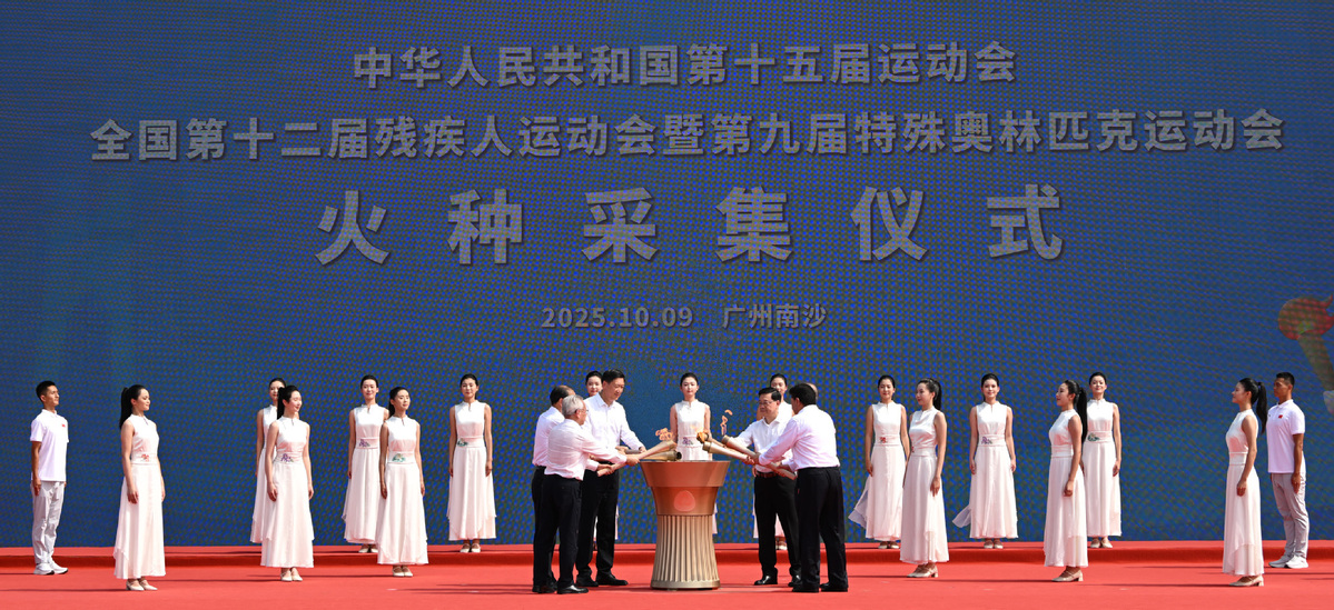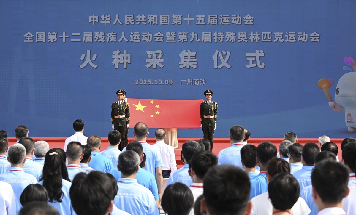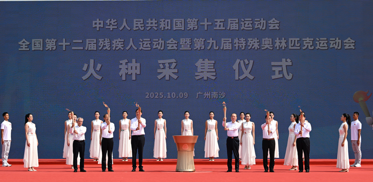 Representatives of marine researchers hold the flame for the 15th National Games of the People's Republic of China, the 12th National Games for Persons with Disabilities and the 9th National Special Olympics Games, collected from the deep sea, during the flame-gathering ceremony in Guangzhou, Guangdong province, on October 9, 2025. [Photo/Xinhua]